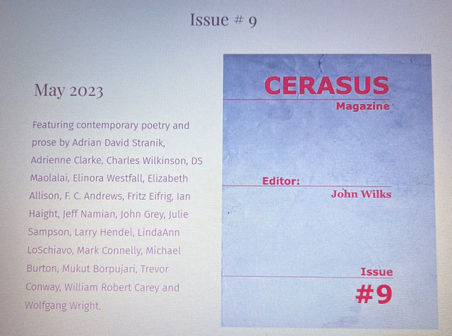 A further publication in 2023 was the acceptance of the poem “Mapping with Pegman” by Cerasus Magazine (Issue 9). The poem is addressed to “Pegman”, the figure used in online mapping tools, and reflects on digital navigation as a means of revisiting a childhood town through memory and revision. Thanks are due to John Wilks, editor of Cerasus Magazine.