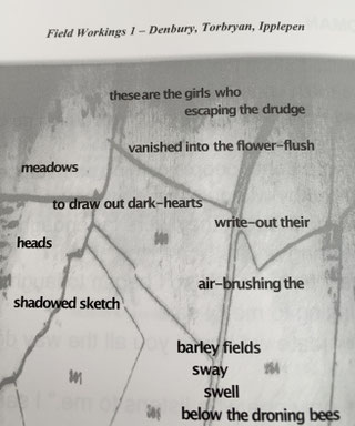 One of a series of layered “field” poems, developed through research into maternal family history, was published in The Projectionist’s Playground, edited by Julian Smit. The poem, “Field Workings I: Denbury, Torbryan, Ipplepen”, appeared in Issue 11 of the magazine. The Projectionist’s Playground was noted for its focus on contemporary, exploratory work, and the inclusion of this poem formed part of an ongoing engagement with visual and cartographic poetry. An image fragment from the poem is reproduced here.